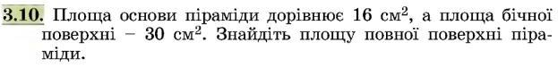 Площа основи: S_осн = 16 см²Площа бічної поверхні: S_біч = 30 см²Знаходимо площу повної поверхні:S_повн = S_осн + S_бічS_повн = 16 см² + 30 см²S_повн = 46 см²Отже, площа повної поверхні піраміди дорівнює 46 см².