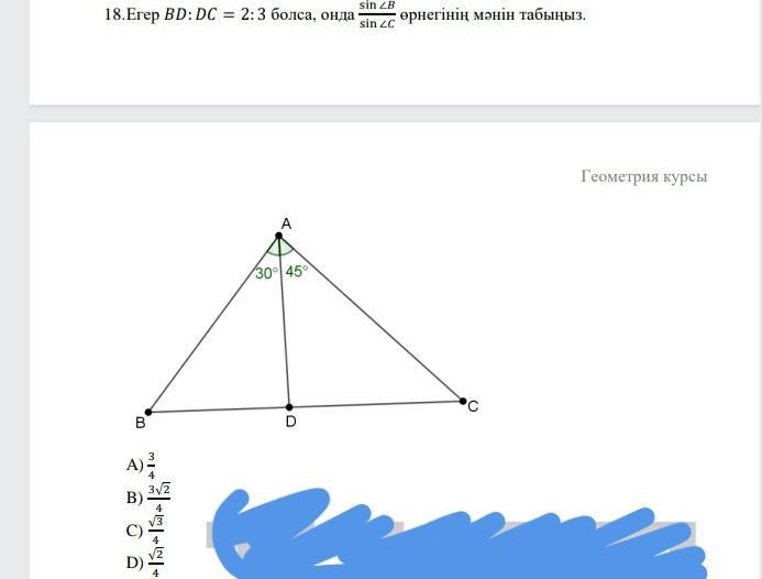 => BD/DC= AD*sin30°/sin∡B : AD*sin 45°/sin∡C =0.5*sin∡C/((√2/2)*sin∡B) =sin∡C/(√2*sin∡B)