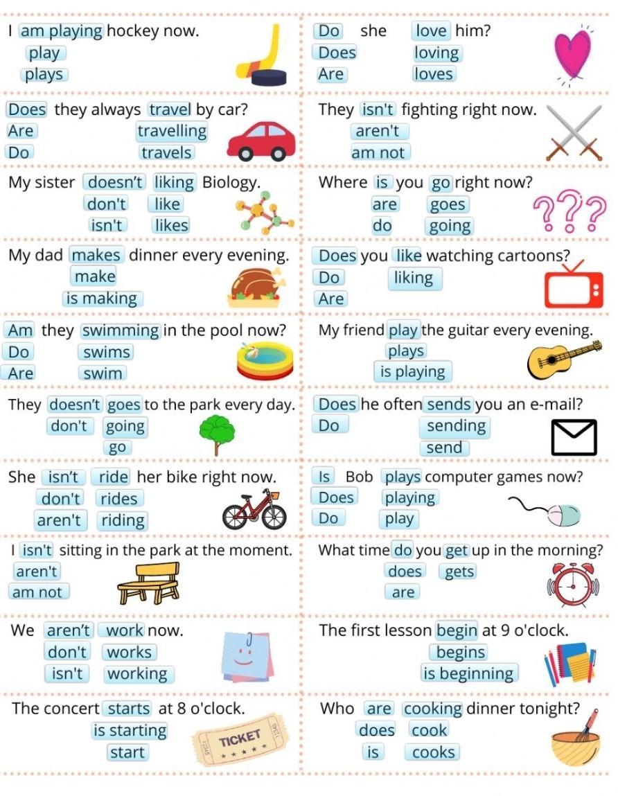 Choose the correct verb form. I am playing hockey now. play plays Does they always travel by car? Are travelling Do travels My sister doesn't liking Biology. don't like isn't likes My dad makes dinner every evening. make is making Am they swimming in the pool now? swims Do Are swim They doesn't goes to the park every day. don't going go She isn't ride her bike right now. don't rides ovo aren't riding I isn't sitting in the park at the moment. aren't am not We aren't work now. don't works isn't working The concert starts at 8 o'clock. is starting start TICKET : Do she Does Are love him? loving loves They isn't fighting right now. aren't am not X ??? Where is you go right now? are goes do going Does you like watching cartoons? liking Do Are 17 My friend play the guitar every evening. plays is playing Does he often sends you an e-mail? Do sending send Is Bob plays computer games now? Does playing play Do What time do you get up in the morning? does gets are The first lesson begin at 9 o'clock.