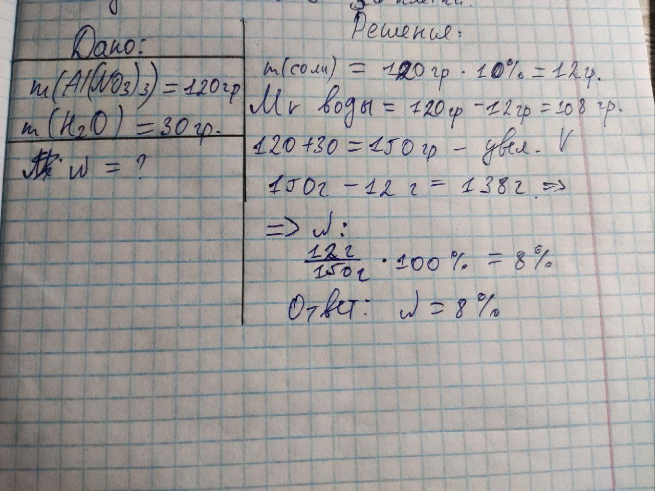 1. До 120 г 10% розчину алюмінію нітрату (Al(NO3)3) додали 30 г води. Визначити масову частку солі у новому розчині.