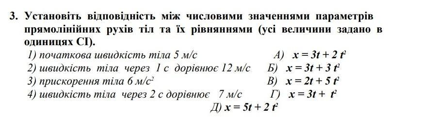ДАЮ 100 БАЛЛОВ ПРОШУ ПОМОГИТЕ 3. Установіть відповідність між числовими значеннями параметрів прямолінійних рухів тіл та їх рівняннями (усі величини задано в одиницях CI). 1) початкова швидкість тіла 5 м/с 2) швидкість тіла через 1 с дорівнює 12 м/с 3) прискорення тіла 6 м/с² 4) швидкість тіла через 2 с дорівнює 7 м/с Д) x = 5t + 2 A) x=3t + 2 Б) x = 3t +3F B) x = 2t + 5 x=3t+t Г)