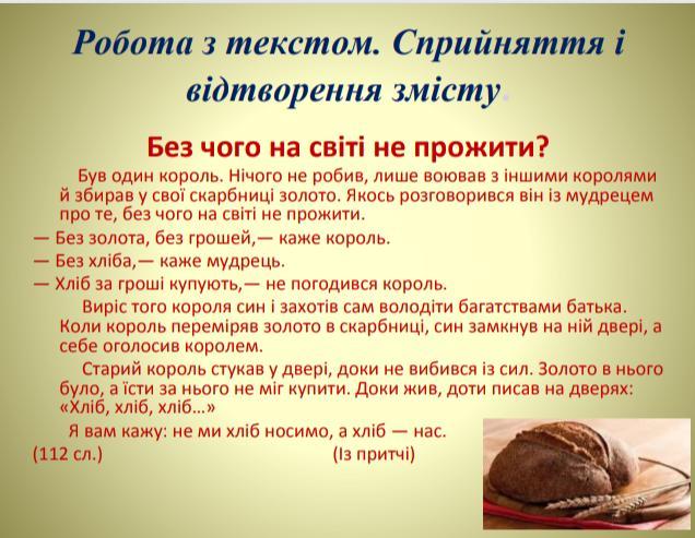 ответ- був один король. Якось розговорився він із мудрицем про те, без чого не можно на світі не прожити.Без грошей- каже король. Без хліба- каже мудрець. Виріс того короля син і захотів сам володіти багатствами батька. Коли король переміряв золото в скарбниці, син замкнув на ній двері, а себе оголосив королем. Золото у нього було, а їсти нечого. Доки він жив, доти писав на дверях- Хліб,Хліб,Хліб. Я вам кажу: не ми носимо хліб, а хліб нас.