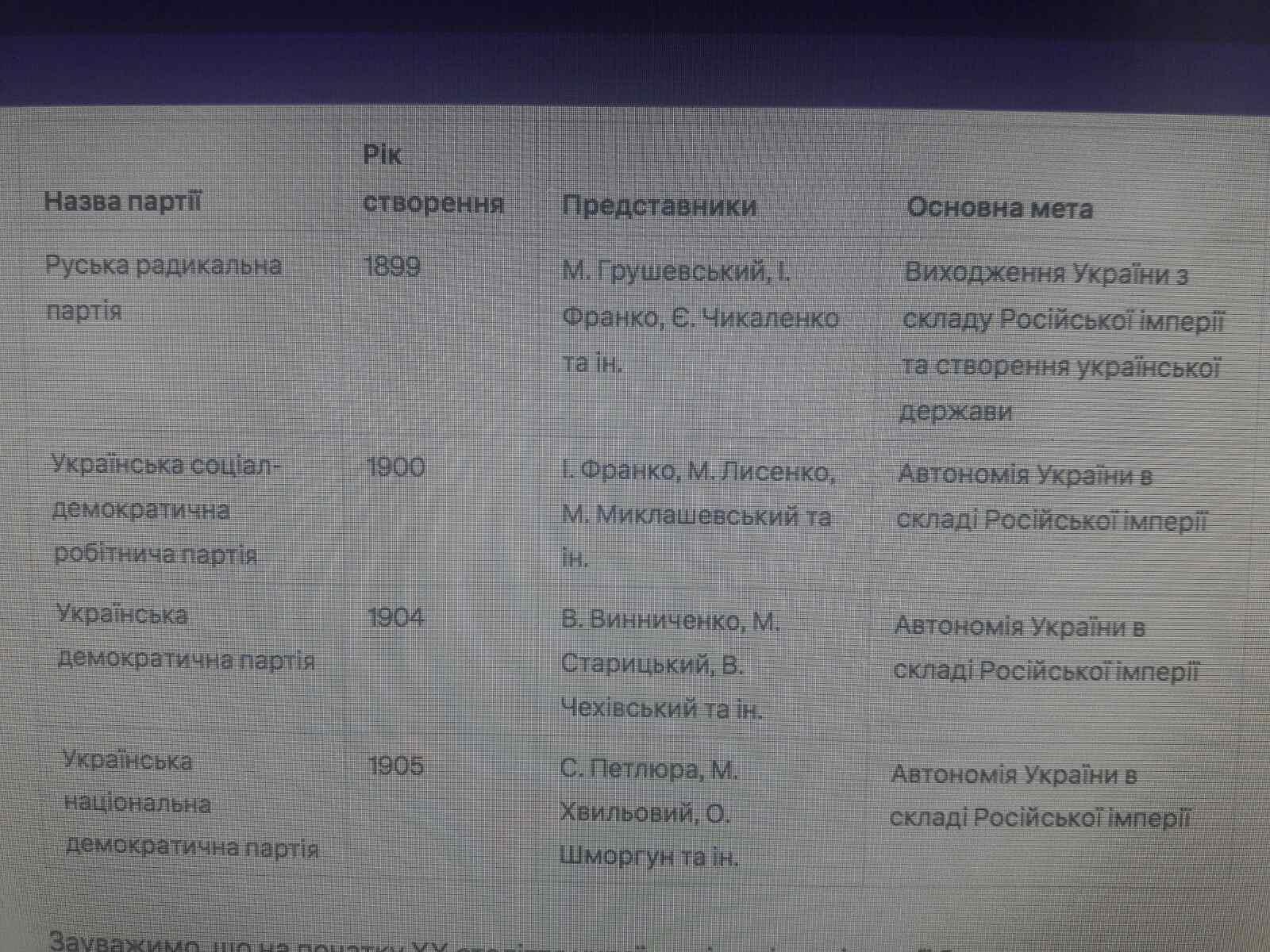 Скласти таблицю "Українські політичні партії на початку ХХ століття"