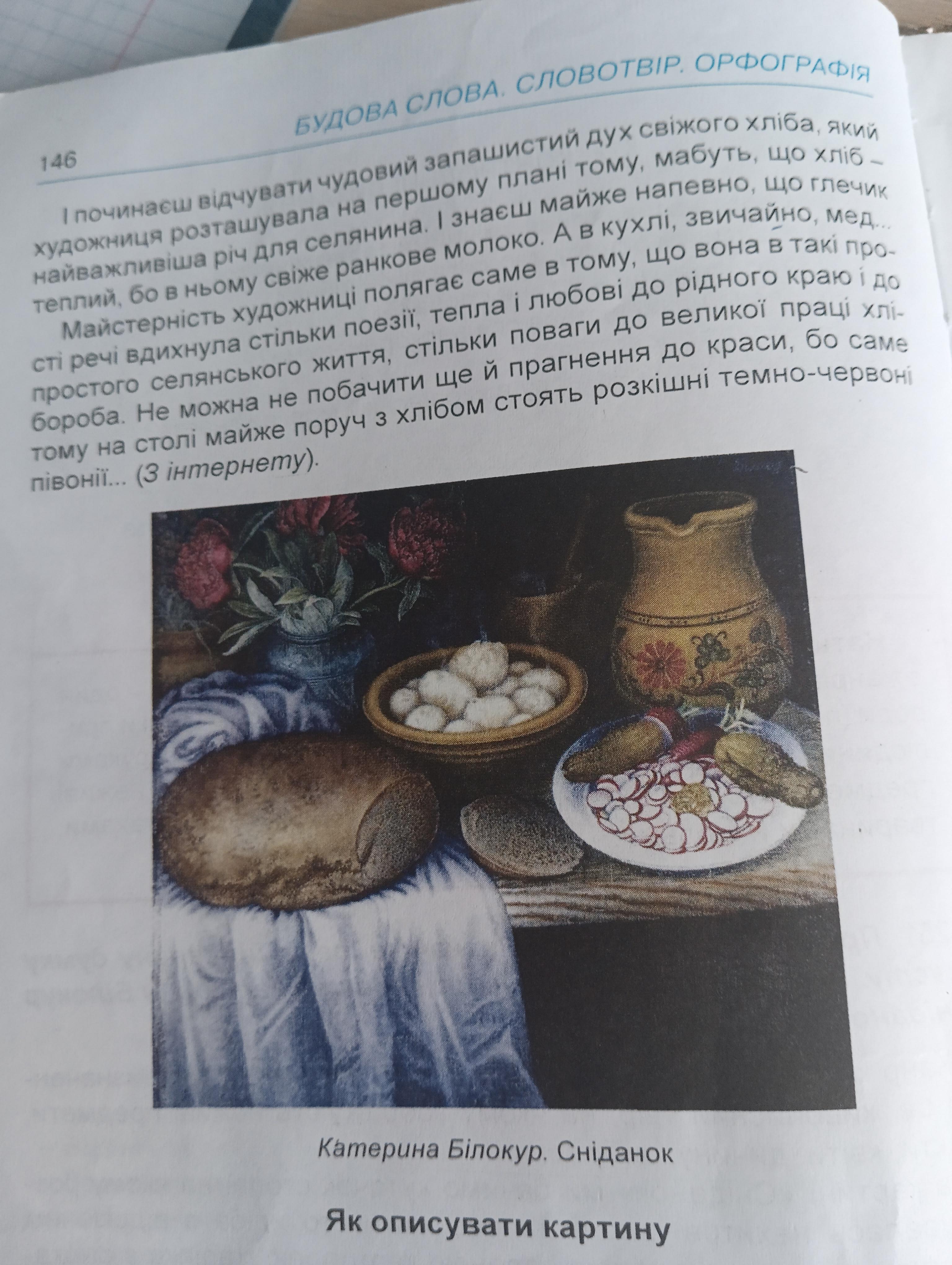 Ми бачимо буханку хліба, глечик припустимо з молоком або квасом. Також на передньому плані стоїть тарілка з овочами,а саме редиска, солоні огірки.