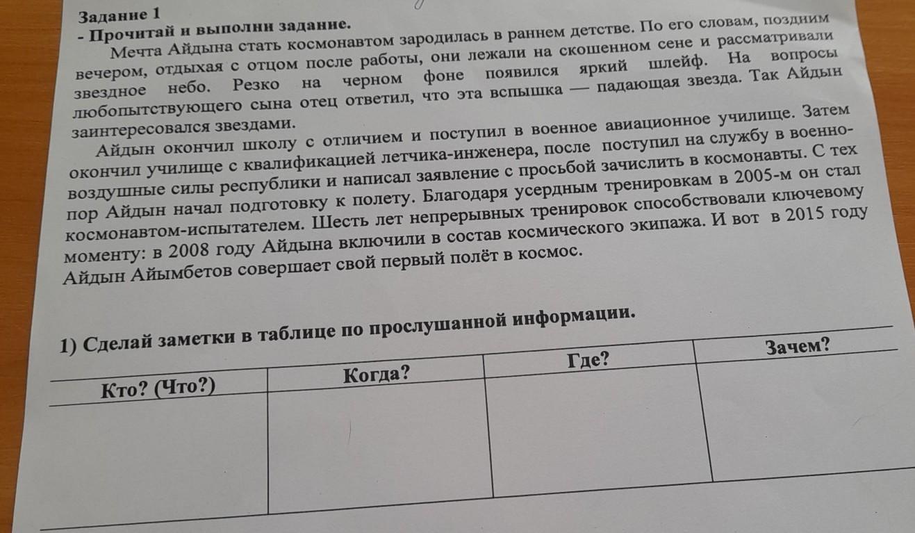 Задание 1 - Прочитай и выполни задание. Мечта Айдына стать космонавтом зародилась в раннем детстве. По его словам, поздним вечером, отдыхая с отцом после работы, они лежали на скошенном сене и рассматривали небо. вопросы Резко шлейф. на черном фоне ПОЯВИЛСЯ яркий любопытствующего сына отец ответил, что эта вспышка - падающая звезда. Так Айдын звездное Ha заинтересовался звездами. Айдын окончил школу с отличием и поступил в военное авиационное училище. Затем окончил училище с квалификацией летчика-инженера, после поступил на службу в военно- воздушные силы республики и написал заявление с просьбой зачислить в космонавты. С тех пор Айдын начал подготовку к полету. Благодаря усердным тренировкам в 2005-м он стал космонавтом-испытателем. Шесть лет непрерывных тренировок способствовали ключевому моменту: в 2008 году Айдына включили в состав космического экипажа. И вот Айдын Айымбетов совершает свой первый полёт в космос. в 2015 году