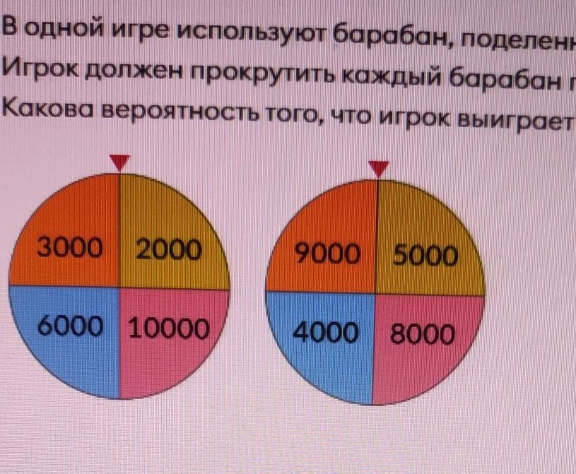 В одной игре используют барабан, поделенный на секторы с различными баллами, как показано на рисунке. Игрок должен прокрутить каждый барабан по одному разу и получить сумму баллов выпавших секторов. Какова вероятность того, что игрок выиграет ровно 15000 баллов?