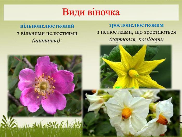 2.Визначте, яка чашечка в запропонованої квітки - роздільнолиста чи зрослолиста ;який віночок - вільнопелюстковий чи зрослопельстковий.