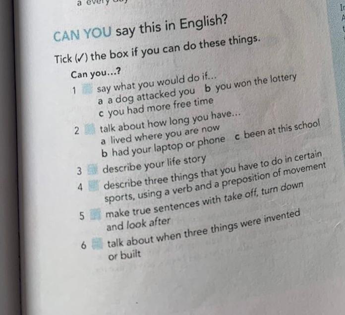CAN YOU say this in English? Tick (✔) the box if you can do these things. Can you...? 1 2 talk about how long you have... a lived where you are now b had your laptop or phone c been at this school describe your life story 3 4 5 say what you would do if... a a dog attacked you b you won the lottery c you had more free time 6 describe three things that you have to do in certain sports, using a verb and a preposition of movement make true sentences with take off, turn down and look after talk about when three things were invented or built