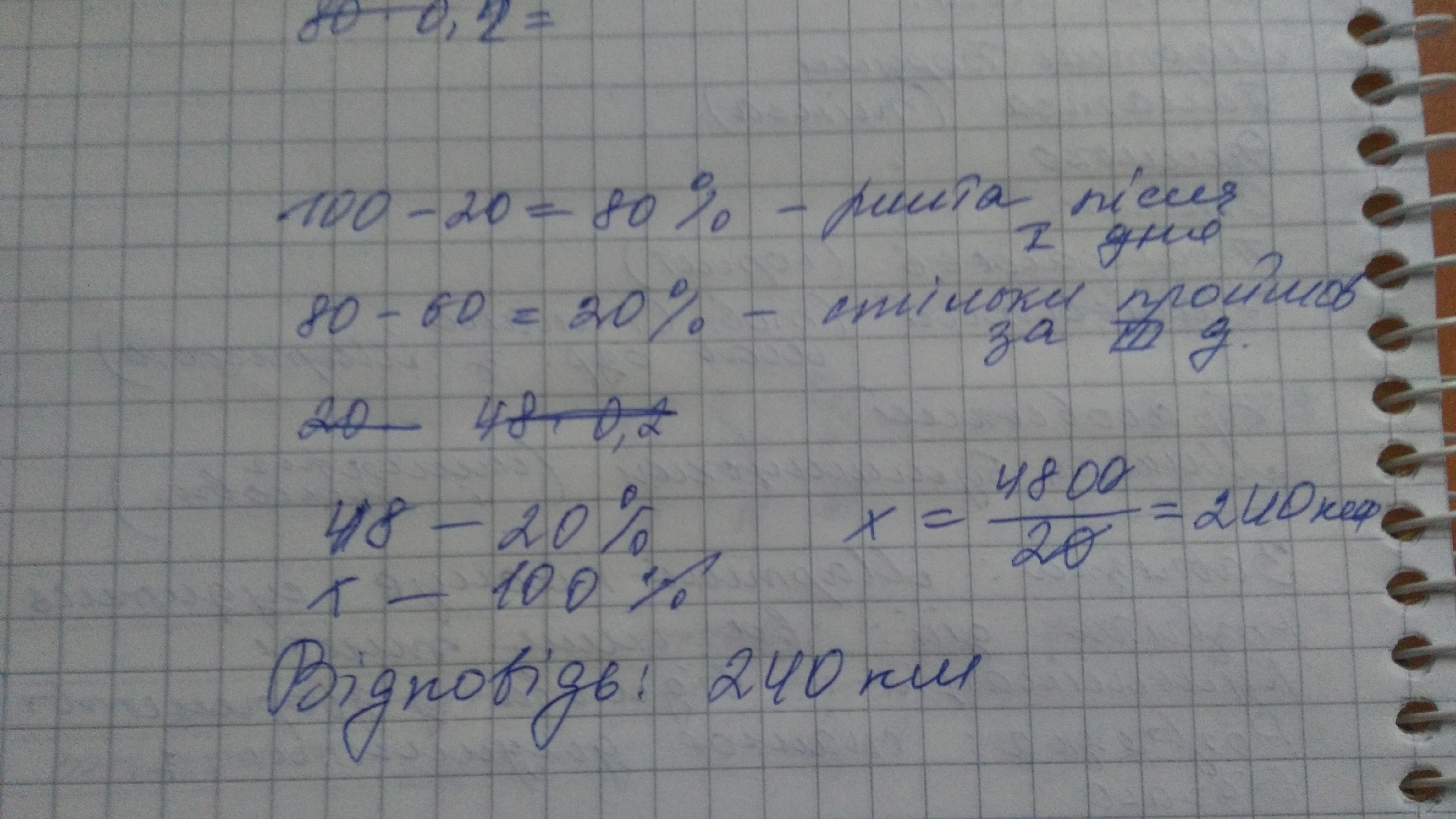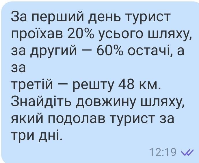 за перший день турист подолав 20% всього шляху. за другий 60% остачі. за третій- решту 48 км. який шлях подолав турист за три дні