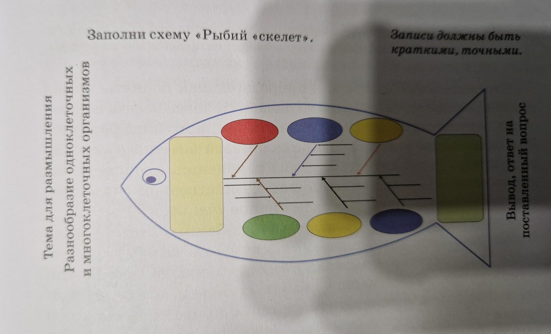 Используя дополнительные источники, подготовь сообщение о раз- нообразии одноклеточных животных. Заполни схему «Рыбий «скелет». Тема для размышления Разнообразие одноклеточных и многоклеточных организмов Записи должны быть краткими, точными. Вывод, ответ на поставленный вопрос