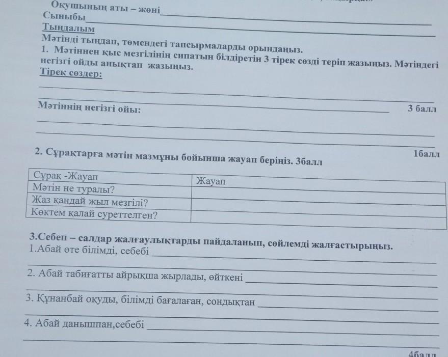 Біздін еліміздін табиғаты оте ерекше. Жыл мезгілінің қай тұсын алсан да, я каламыз, я ауылымыз жайнап тұрады. Қазір кыс мезгілін алсак, терең тыныс алатын таза ауа, ак корпесін жамылған жер, екі беттері алмадай боп шана тепкен балалар. Ал, енді көктемге мезгіліне сипаттама берсек, жан-жактын бәрі көгеріп, жер астынан бәйшешегіміз бүршік атып шыгады. Жаз нагыз жеміс-жидектің пісіп, балалардың мәз-мейрам болатын уакыты Кунге токталсак, бул жыл мезгілі әсіресе акынга-апаларымыз тілін тусіне білетін алтын на косата. И аз калай дегенде де менің өлкемнің табиғаты тамаша, кен байтак! Мен осы елде казак болып туылғаныма куанамын, помогите пожалуйста у меня есть 10 часов даю 60 баллов