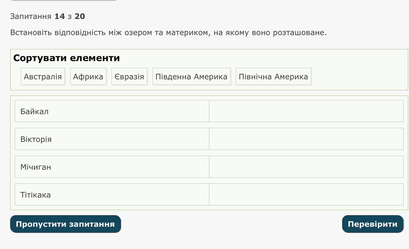 Встановіть відповідність між озером та материком, на якому воно розташоване СРОЧНООО
