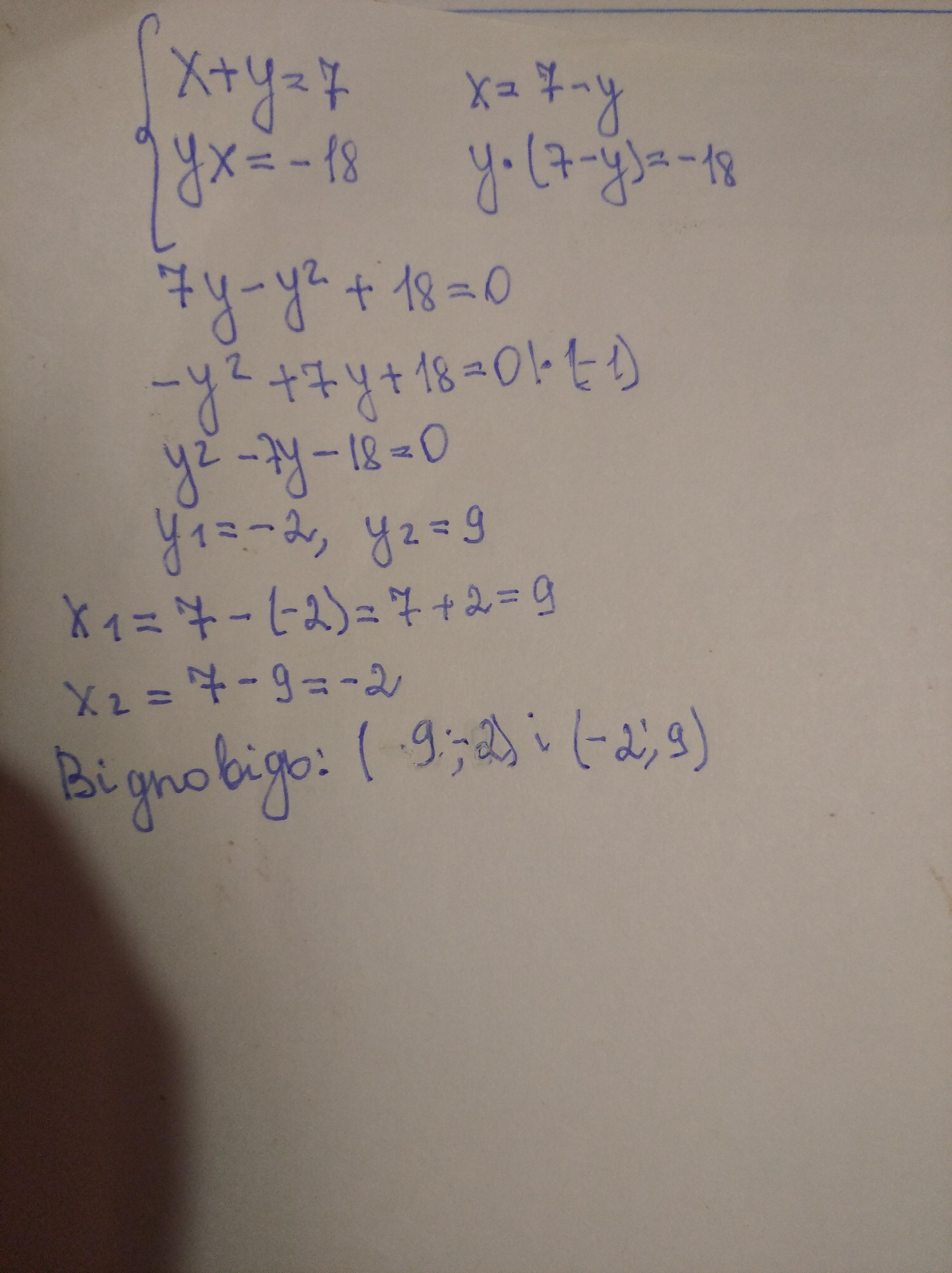 З першого рівняння отримуємо y = 7 - x. Підставимо це у друге рівняння: