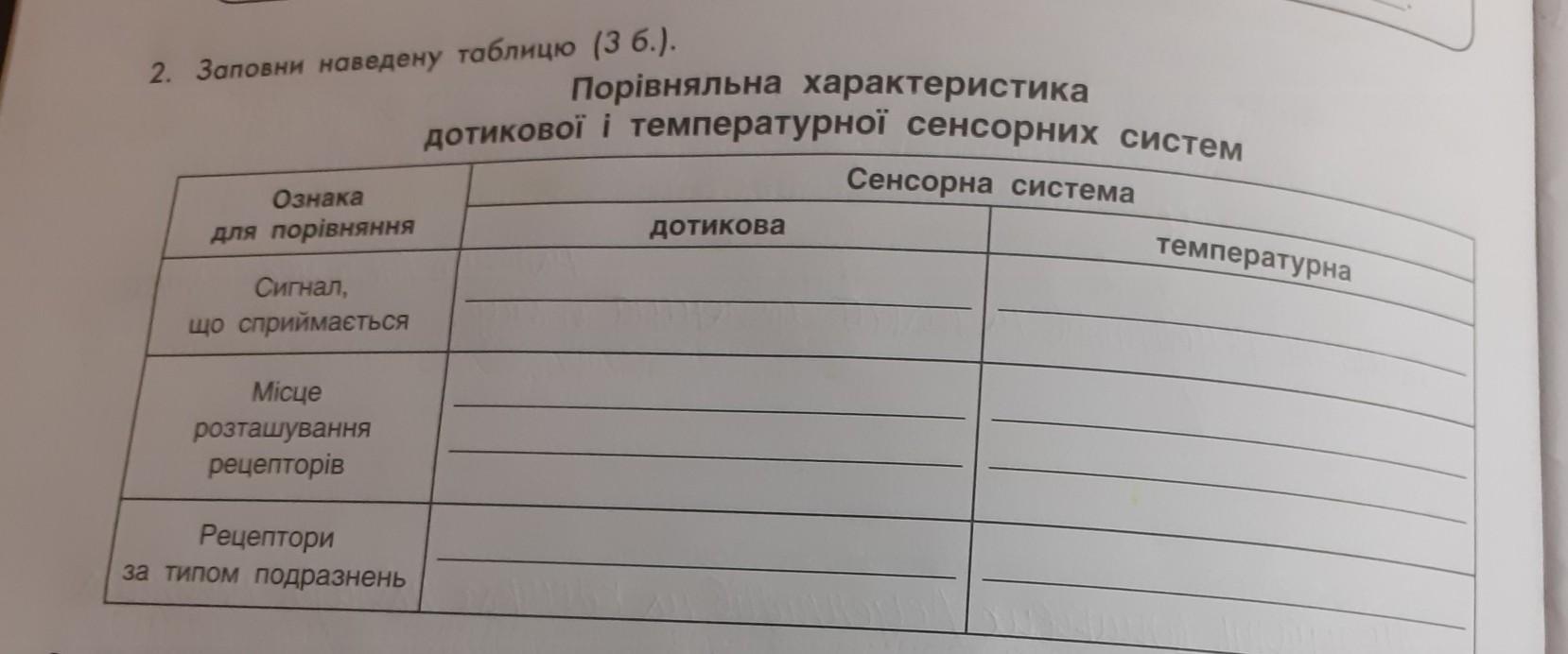 Порівняльна характеристика додаткової і температурної сенсорних систем Сигнал. що сприймається. Місце розташування рецепторів. Рецептори за типом подразнень