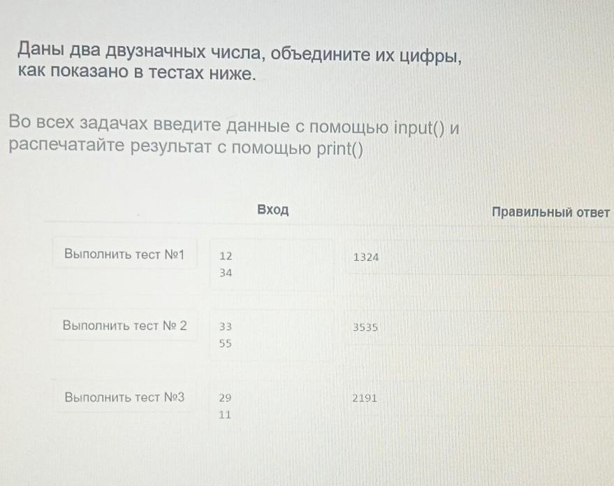 Даны два двузначных числа, объедините их цифры, как показано в тестах ниже. Во всех задачах введите данные с помощью input() и распечатайте результат с помощью print() Выполнить тест №1 Выполнить тест № 2 Выполнить тест №3 12 34 33 55 29 11 Вход 1324 3535 2191 Правильный ответ