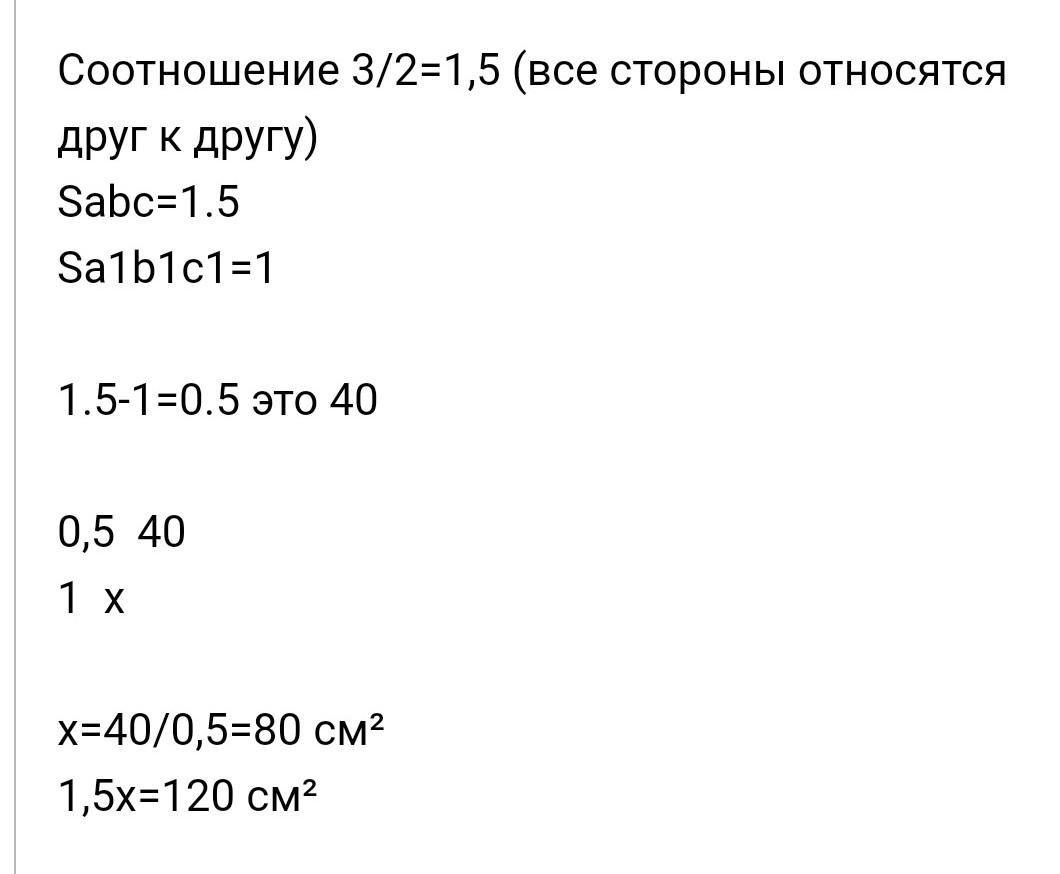 Пусть одна часть в отношении будет х, тогда S(ABC)=9х, S(A1B1C1)=4х