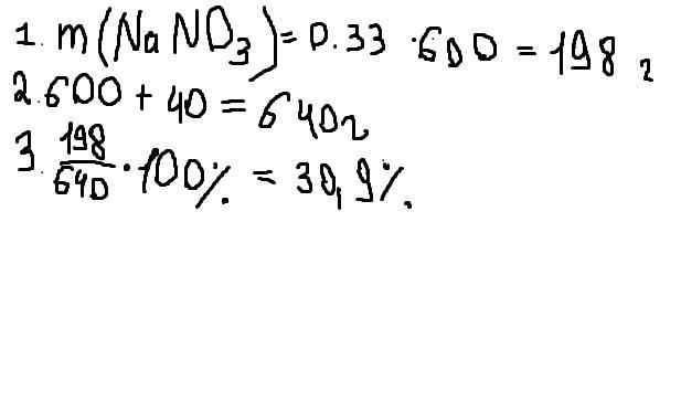 До 600 г розчину натрій нітрату NaNO3 з масовою часткою солі 33 % додали 40 мл води. Укажи масову частку натрій нітрату NaNO3 в утвореному розчині.