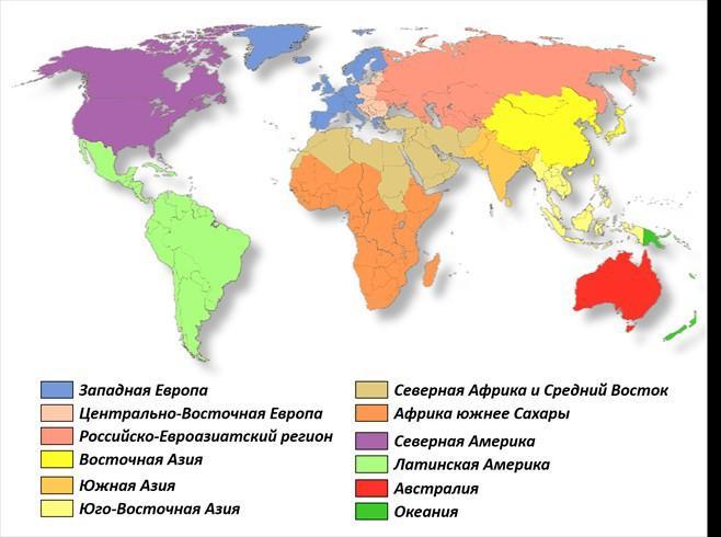 На данный момент мир делится на 5 географических регионов. А так же на большее количество субрегионов, то есть частей определенного региона. К примеру Центральная и Восточная Азия являются субрегионами Азии.
