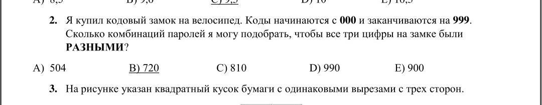 2. Я купил кодовый замок на велосипед. Коды начинаются с 000 и заканчиваются на 999. Сколько комбинаций паролей я могу подобрать, чтобы все три цифры на замке были РАЗНЫМИ? A) 504 2 B) 720 C) 810 D) 990 E) 900