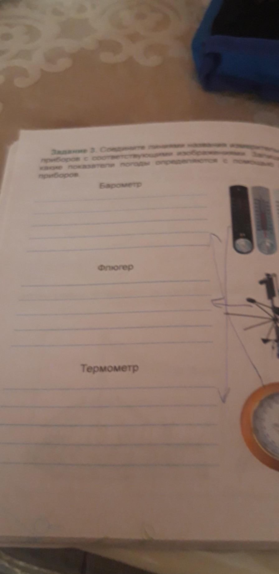 54 Задание 3. Соедините линиями названия измерител приборов с соответствующими изображениями Запе какие показатели погоды определяются с помощью приборов Барометр Флюгер Термометр