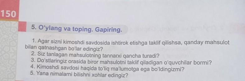 50 5. O'ylang va toping. Gapiring. 1. Agar sizni kimoshdi savdosida ishtirok etishga taklif qilishsa, qanday mahsulot bilan qatnashgan bo'lar edingiz? 2. Siz tanlagan mahsulotning tannarxi qancha turadi? 3. Do'stlaringiz orasida biror mahsulotni taklif qiladigan o'quvchilar bormi? 4. Kimoshdi savdosi haqida to'liq ma'lumotga ega bo'ldingizmi? 5. Yana nimalarni bilishni xohlar edingiz?
