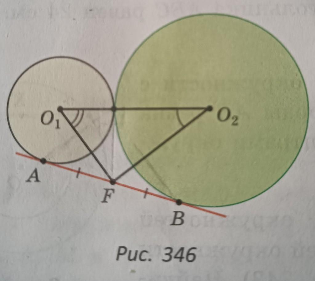 Прямая АВ -общая внешняя касательная двух окружностей с центрами О1 и 02, которые касаются внешним образом (рис. 346), точки касания прямой А и B-точки касания прямой AB и окружностей, точка F - середина отрезка AB, угол o1o2f=37,найти угол Fo1o2