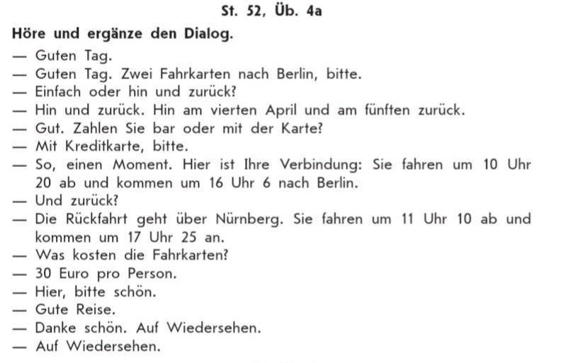 Ответ:Хороший день. · Хороший день. Два квітки до Берліна, будь ласка. Або просто туди- сюди? Туди й назад. Виїзд четвертого квітня і назад п'ятого. dobre. Ви платите готівкою чи карткою? — З кредитною карткою, будь ласка. Ось, почекай хвилинку. Якщо так, то це за розкладом: коли годинник настає о 10:20 ранку, час для Берліна вказується о 16:6. - А назад? - Зворотній шлях через Нюрнберг. Вони відправляються об 11:10 і прибувають о 17:25. Скільки коштують квітки? 30 євро з людиною. Ось вам Щасливої дороги. Велике спасибі. до побачення до побачення