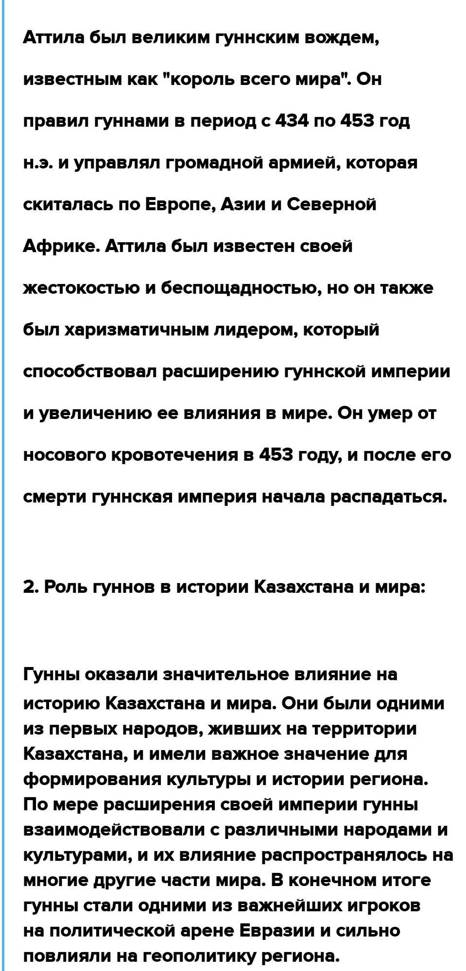 Пояснення: Гуни - це одне з народів, яке з'явилось на історичній сцені в середині III століття нашої ери в степах Центральної Азії. Вони мали великий вплив на історію Казахстану та світу.