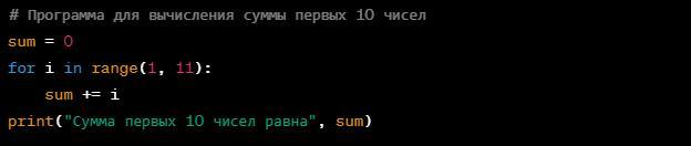В этом примере переменная i является субъектом цикла и используется для хранения значений, возвращаемых циклом в каждой итерации. Каждый раз, когда цикл выполняется, переменная i увеличивается на 1, начиная с 1 и заканчивая 10. Значения i используются для подсчета суммы первых 10 чисел.