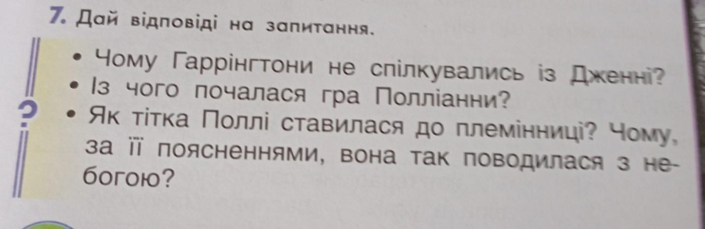7. Дай відповіді на запитання. Чому Гаррінгтони не спілкувались із Дженні? • Із чого почалася гра Полліанни? • Як тітка Поллі ставилася до племінниці? Чому, за її поясненнями, вона так поводилася з не- богою?