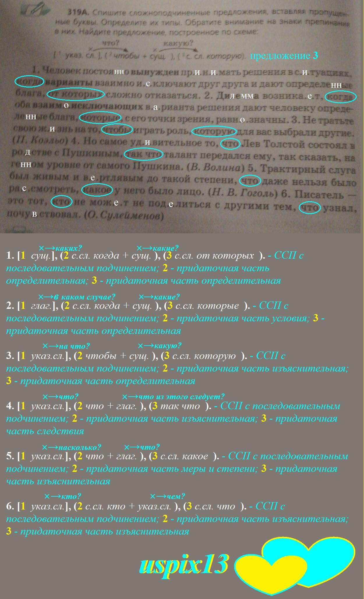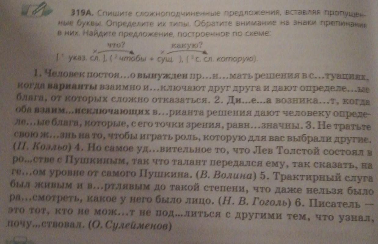 зделайте пожалуйста способам вертикальным столбиком 40 баллов 319А. Спишите сложноподчиненные предложения, вставляя пропущен ные буквы. Определите их типы. Обратите внимание на знаки препинания в них. Найдите предложение, построенное по схеме: YTO? какую? [1 указ. сл. ], (2 чтобы + сущ. ), ( 'с. сл. которую). 1. Человек постоя...о вынужден пр........мать решения вс...туациях, когда варианты взаимно и...ключают друг друга и дают определе... блага, от которых сложно отказаться. 2. Ди......... возника...т, когда оба взаим...исключающих в...рианта решения дают человеку опреде ле...ые блага, которые, с его точки зрения, равн...значны. 3. Не тратьте свою ж...знь на то, чтобы играть роль, которую для вас выбрали другие. (П. Коэльо) 4. Но самое уд...вительное то, что Лев Толстой состоял po...стве с Пушкиным, так что талант передался ему, так сказать, на ге...ом уровне от самого Пушкина. (В. Волина) 5. Трактирный слуга был живым и в...ртлявым до такой степени, что даже нельзя было ра...смотреть, какое у него было лицо. (Н. В. Гоголь) 6. Писатель это тот, кто не мож...т не под...литься с другими тем, что узнал, почу...ствовал. (О. Сулейменов)