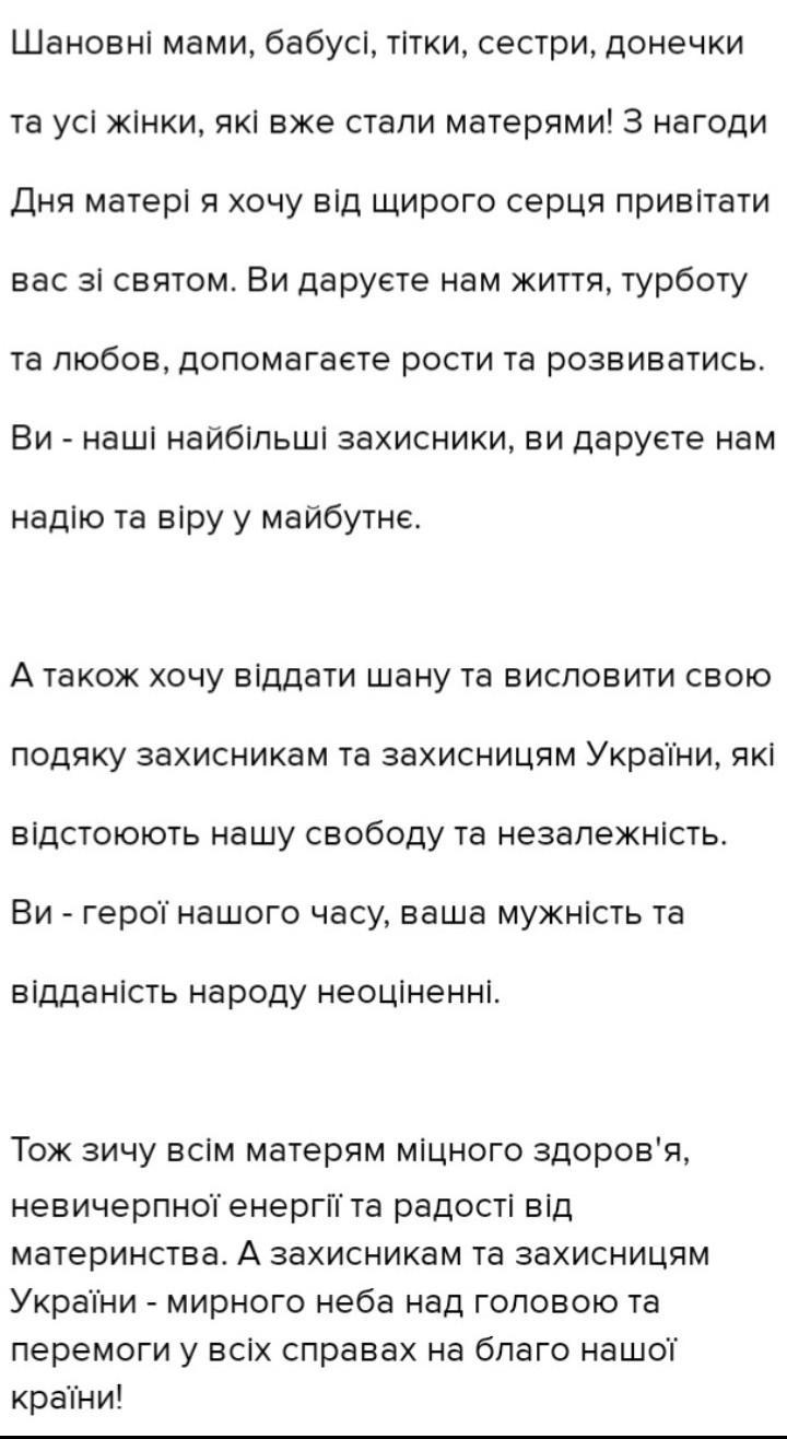 Складіть і запишіть текст привітання (4—6 речень) з нагоди Дня матері або Дня захисників і захисниць України. Використайте в тексті 2 звертання. За потреби скористайтеся довідкою.