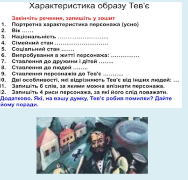 1)Тев'є — цілісна особистість. Він простакуватий і шляхетний, розуміє людей і тонко відчуває красу природи, завжди поводиться гідно і ніколи не грішить проти совісті. Працьовитий, комунікабельний, філософ, любить цитувати Святе письмо, мудрий, вміє прощати, має почуття гумору.