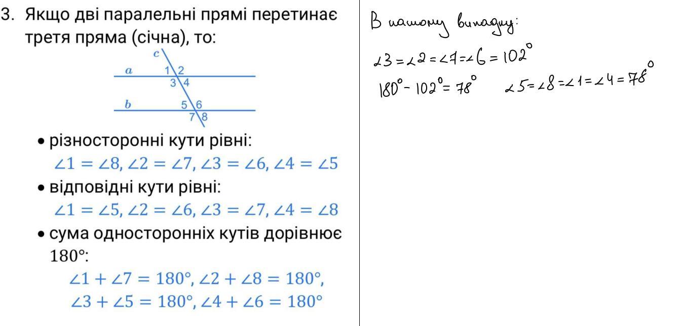 знайдіть усі кути, утворені при перетині двох паралельних прямих січною, якщо один із них дорівнює 102°