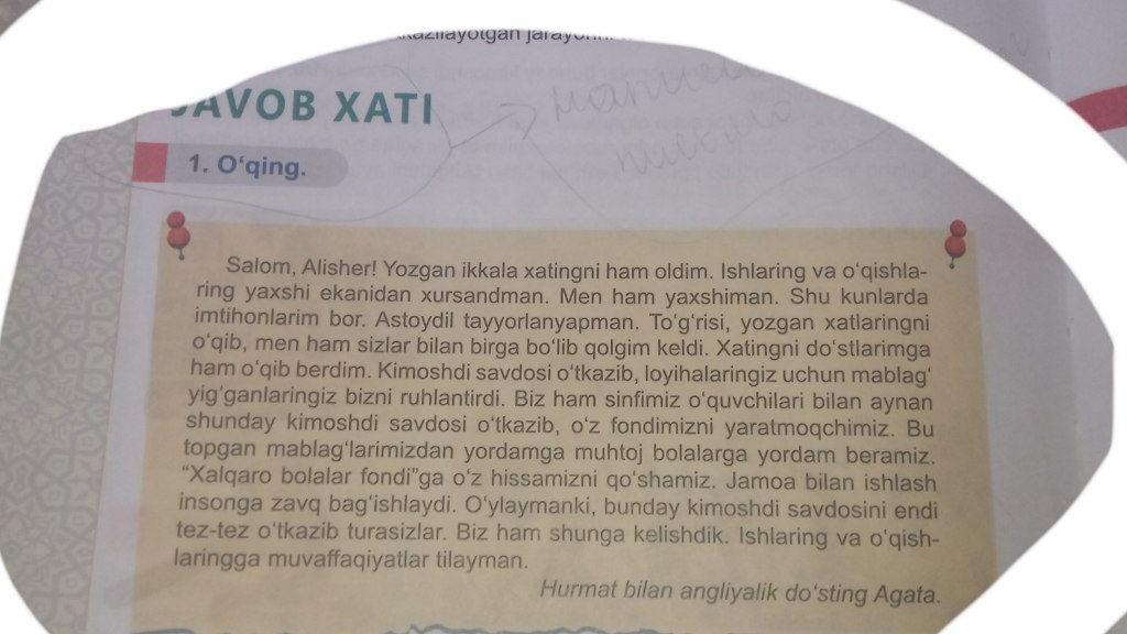 Ответ:Salom Alisha! Men sizning xatingizni oldim. Ishingiz yaxshi ketayotganidan xursandman. Men ham yaxshiman. Shu kunlarda bizni juda ko'p sinovlar kutib turibdi. Men qattiq tayyorlanyapman. Aslida maktublaringizni o‘qib, siz bilan tunashni xohlardim. Maktubingizni do‘stlarim bilan o‘qib chiqdim. Biz kimoshdi savdolarini o'tkazishingiz va loyihalaringiz uchun mablag' to'plashingizdan ilhomlanamiz. Men sinfimiz o‘quvchilari bilan shunday auktsion o‘tkazib, o‘z fondimni yaratmoqchiman. Topgan pulimizga muhtoj bolalarga yordam beramiz. Xalqaro bolalar jamg‘armasiga o‘z hissamizni qo‘shamiz. Jamoa bilan ishlash juda yoqimli. O‘ylaymanki, bunday auksionlarni tez-tez o‘tkazib turasiz. Biz shu narsaga keldik. Ishlaringizga muvaffaqiyatlar tilayman