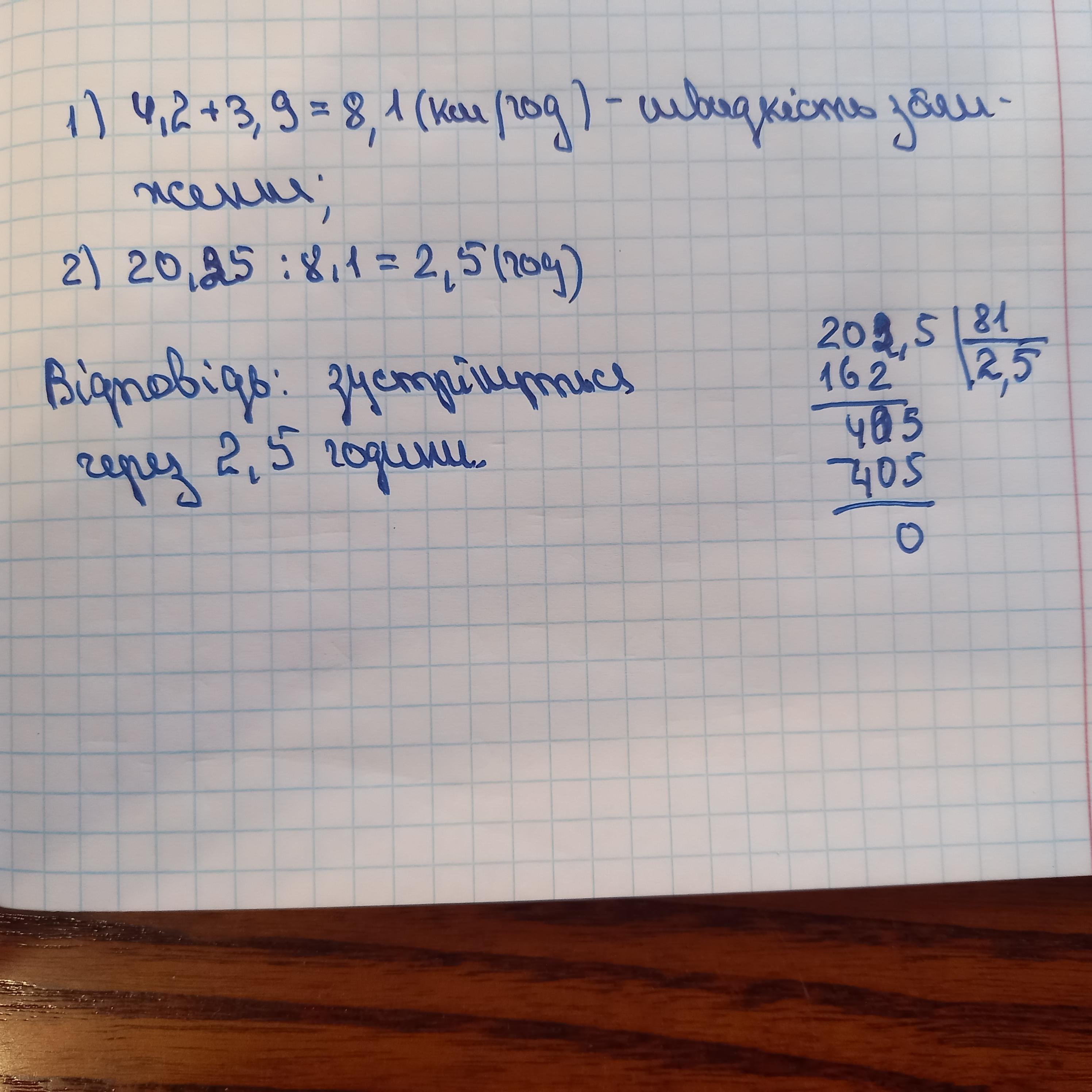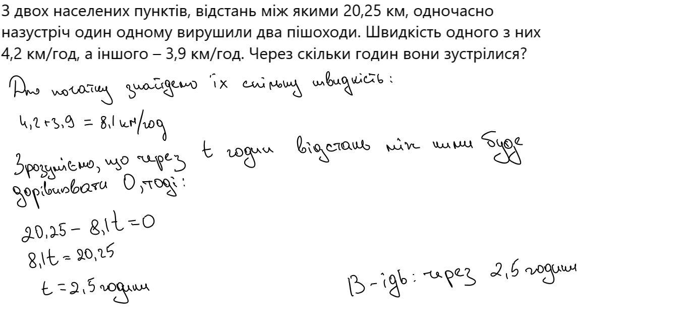 4,2 км/год, а іншого – 3,9 км/год. Через скільки годин вони зустрілися? ДАЮ 25 БАЛЛОВ