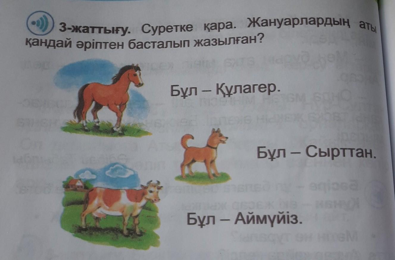 3-жаттығу. Суретке қара. Жануарлардың аты қандай әріптен басталып жазылған? Бұл – Құлагер. Бұл – Сырттан. Бұл - Аймүйіз. -