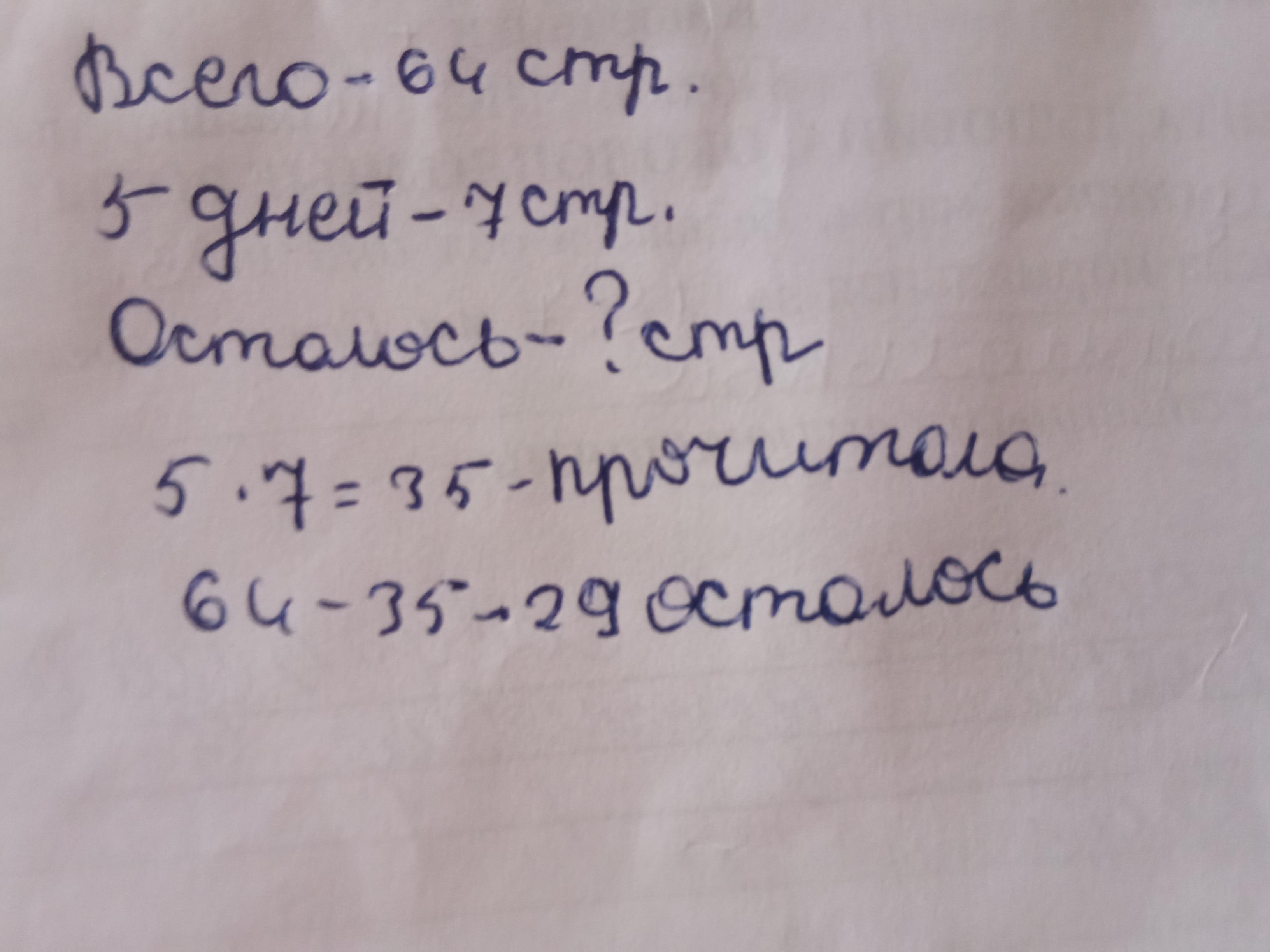 4. Реши задачу. В книге 64 страницы. Айнур читала книгу в тече- ние пяти дней, по 7 страниц ежедневно. Сколько страниц ей осталось прочитать?