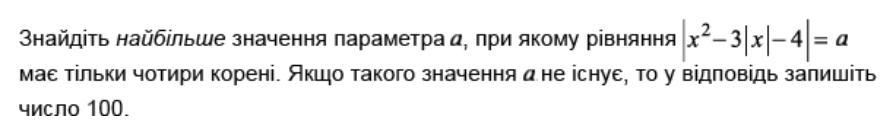 Отже, значення параметра a повинно задовольняти обом умовам: a>-6.25 та a<4.25. Найбільше значення параметра a при якому рівняння |x2-3|x|-4|=a має тільки чотири корені дорівнює 4.25.