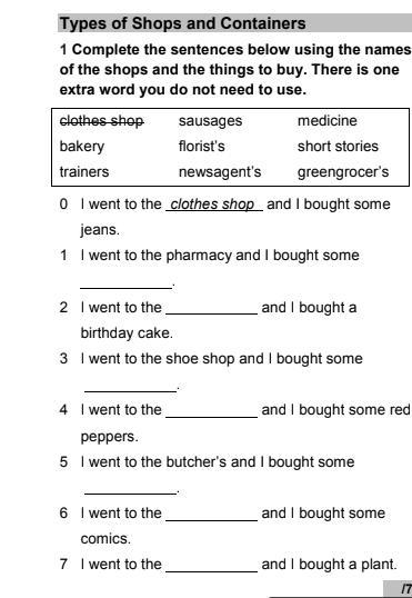АНГЛ 1 Complete the sentences below using the names of the shops and the things to buy. There is one extra word you do not need to use.