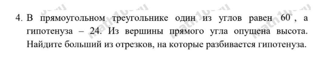 Пошаговое объяснение: Обозначим вершины прямоугольного треугольника через АВС, где С - вершина прямого угла, АВ - гипотенуза, угол В = 60 градусов, СН - высота, опущенная из угла С на гипотенузу АВ. Угол А равен 30 градусов, значит катет, лежащий напртив него равен половине гипотенузы, т.е. СВ=12. По теореме Пифагора второй катет равен 12 умножить на корень квадратный из числа 3. Треугольник АСН по условию прямоугольный с прямым углом Н, в этом треугольнике также имеется угол, равный 30 градусов, это угол А. Против угла А, равного 30 градусов лежит катет СН (он же высота, проведенная к гипотенузе по уловию задачи), СН=6 корней квадратных из числа 3, то есть ровно половине гипотенузы АС треугольника АСН. Теперь наступила очередь теоремы о перпендикуляре, проведенного из прямого угла в прямоугольном треугольнике: квадрат этого перпендикуляра равен произведению отрезков гипотенузы, на которые этот перпендикуляр разбивает гипотенузу. Обозначим один из отрезков(любой) гипотенузы через х, тогда другой отрезок будет иметь вид (24-х). Составляем уравнение для нахождения х: (6 корней квадратных из числа З) в квадрате равно произведению х на (24-х), выполнив умножение, мы получим квадратное уравнение -24х+108=0, решая его, получим корни уравнения х=18 и х=6. Больший из отрезков равен 18, это и есть ответ.