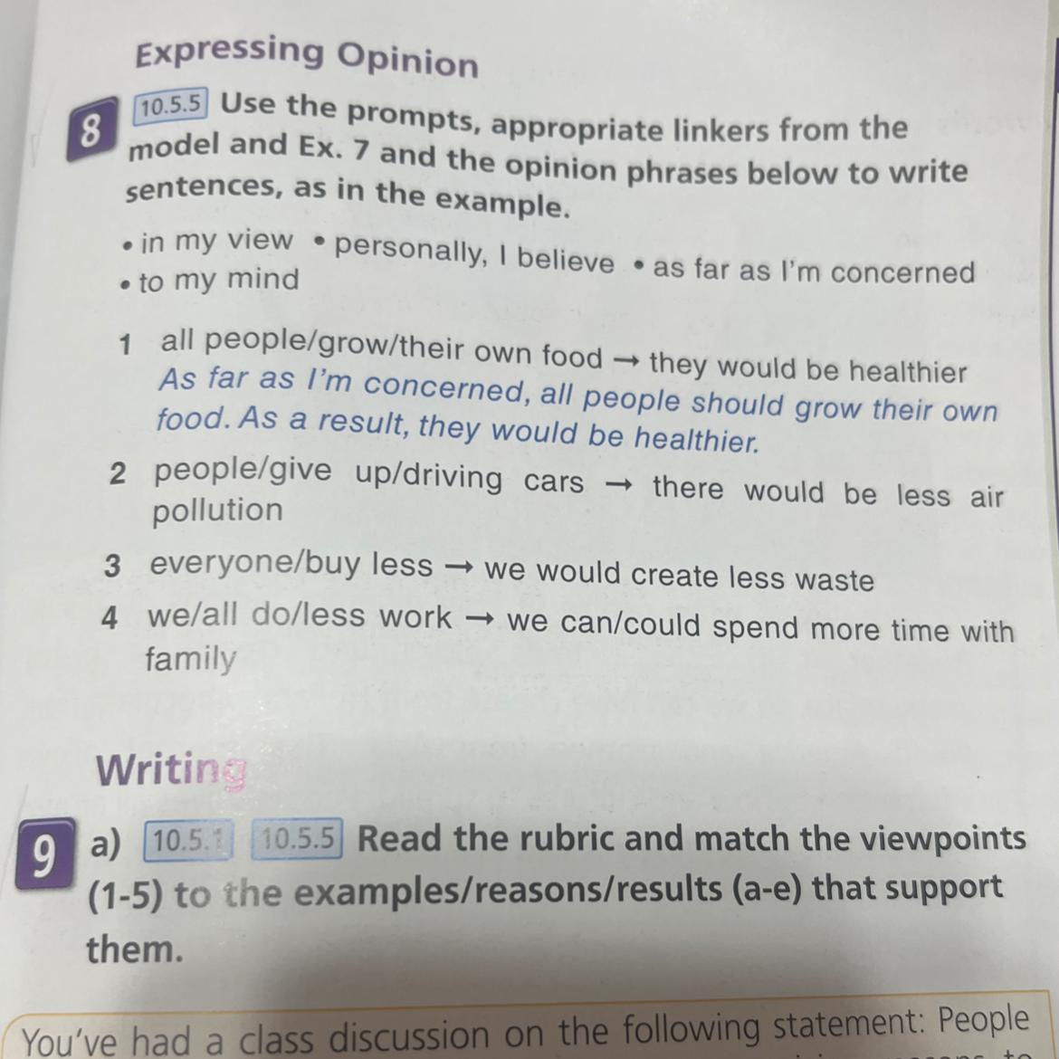1. In my view, if people gave up driving cars, there would be less air pollution.