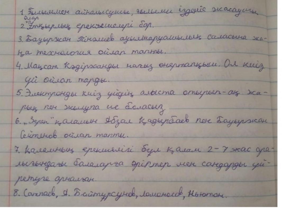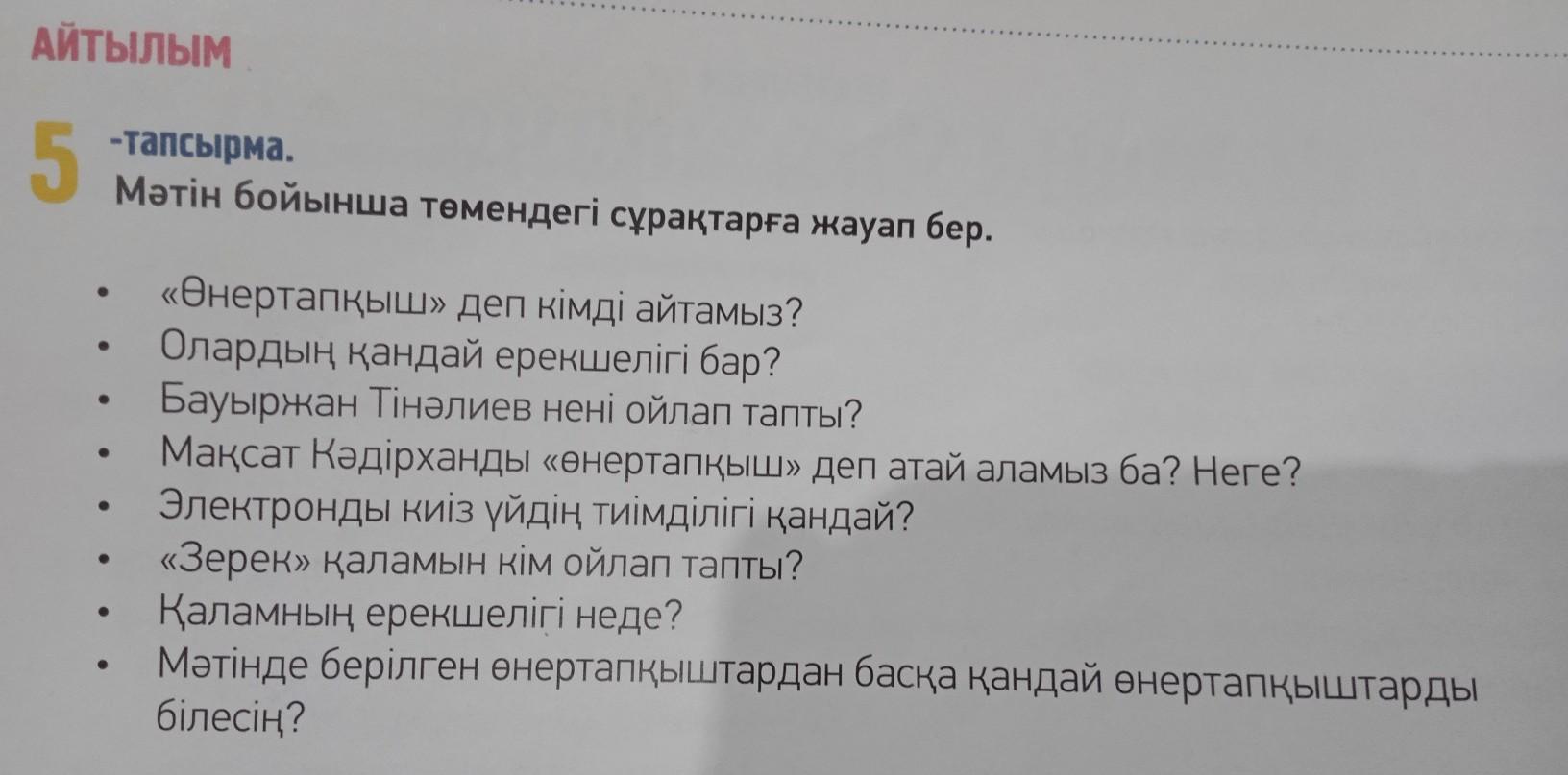 АЙТЫЛЫМ 5 -тапсырма. Мәтін бойынша төмендегі сұрақтарға жауап бер. «Өнертапқыш» деп кімді айтамыз? Олардың қандай ерекшелігі бар? Бауыржан Тінәлиев нені ойлап тапты? Максат Кадiрханды «енертапқыш» деп атай аламыз ба? Неге? Электронды киіз үйдің тиiмдiлiгi кандай? «Зерек» қаламын кім ойлап тапты? Каламның ерекшелігі неде? Мәтінде берілген өнертапқыштардан басқа қандай өнертапқыштарды білесің?