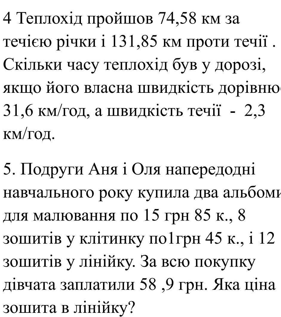 4) 131, 85 : 29,3 = 4,5 (часа) - теплохід пройшов дроти течії річки
