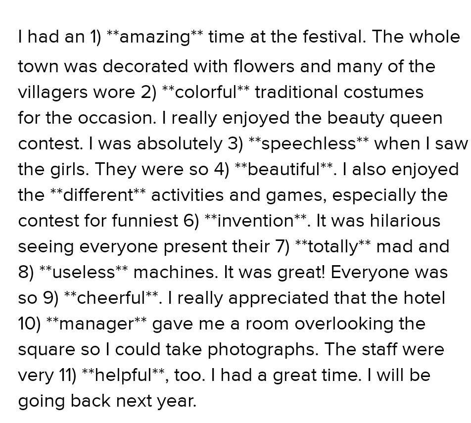 I had an 1) **amazing** time at the festival. The whole town was decorated with flowers and many of the villagers wore 2) **colorful** traditional costumes for the occasion. I really enjoyed the beauty queen contest. I was absolutely 3) **speechless** when I saw the girls. They were so 4) **beautiful**. I also enjoyed the **different** activities and games, especially the contest for funniest 6) **invention**. It was hilarious seeing everyone present their 7) **totally** mad and 8) **useless** machines. It was great! Everyone was so 9) **cheerful**. I really appreciated that the hotel 10) **manager** gave me a room overlooking the square so I could take photographs. The staff were very 11) **helpful**, too. I had a great time. I will be going back next year.