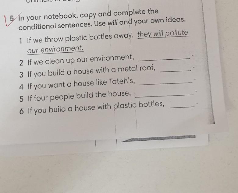 15 5 In your notebook, copy and complete the conditional sentences. Use will and your own ideas. 1 If we throw plastic bottles away, they will pollute our environment. 2 If we clean up our environment, 3 If you build a house with a metal roof, 4 If you want a house like Tateh's, 5 If four people build the house, 6 If you build a house with plastic bottles,