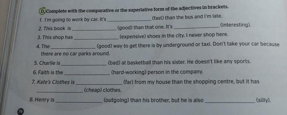 74 D. Complete with the comparative or the superlative form of the adjectives in brackets. 1. I'm going to work by car. It's (fast) than the bus and I'm late. 2. This book is 3. This shop has 4. The there are no car parks around. 5. Charlie is 6. Faith is the 7. Kate's Clothes is 8. Henry is (good) than that one. It's (expensive) shoes in the city. I never shop here. (good) way to get there is by underground or taxi. Don't take your car because (interesting). (bad) at basketball than his sister. He doesn't like any sports. (hard-working) person in the company. (far) from my house than the shopping centre, but it has (cheap) clothes. (outgoing) than his brother, but he is also (silly). помогите пожалуйста очень срочно даю 30 балов