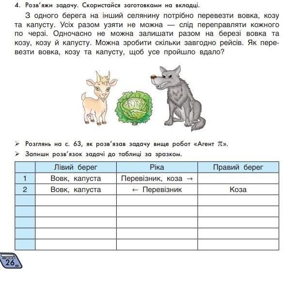 4. Розв'яжи задачу. Скористайся заготовками на вкладці. З одного берега на інший селянину потрібно перевезти вовка, козу та капусту. Усіх разом узяти не можна слід переправляти кожного по черзі. Одночасно не можна залишати разом на березі вовка та козу, козу й капусту. Можна зробити скільки завгодно рейсів. Як пере- везти вовка, козу та капусту, щоб усе пройшло вдало? Розглянь на с. 63, як розв'язав задачу вище робот «Агент П». Запиши розв'язок задачi до таблиці за зразком. Piка 1 2 - Лівий берег Вовк, капуста Вовк, капуста Перевізник, коза - Перевізник Правий берег Коза