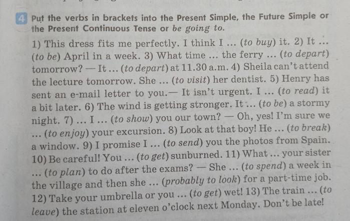 1) This dress fits me perfectly. I think I am going to buy it. 2) It will be April in a week. 3) What time is the ferry departing tomorrow? - It is departing at 11.30 a.m. 4) Sheila can't attend the lecture tomorrow. She is visiting her dentist. 5) Henry has sent an e-mail letter to you. - It isn't urgent. I will read it a bit later. 6) The wind is getting stronger. It is going to be a stormy night. 7) Can I show you our town? - Oh, yes! I'm sure we will enjoy your excursion. 8) Look at that boy! He is breaking a window. 9) I promise I will send you the photos from Spain.