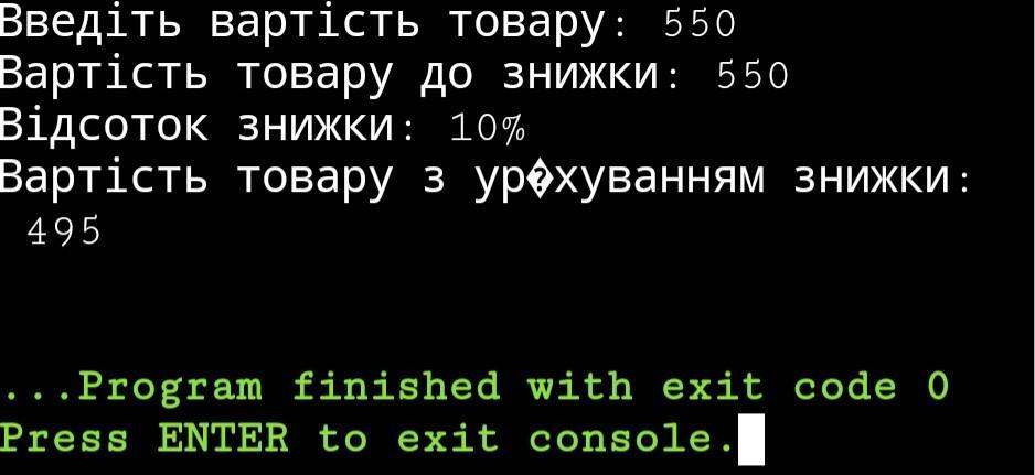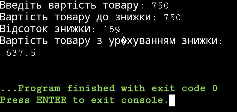 cout << "Вартість товару з урахуванням знижки: " << total << endl;